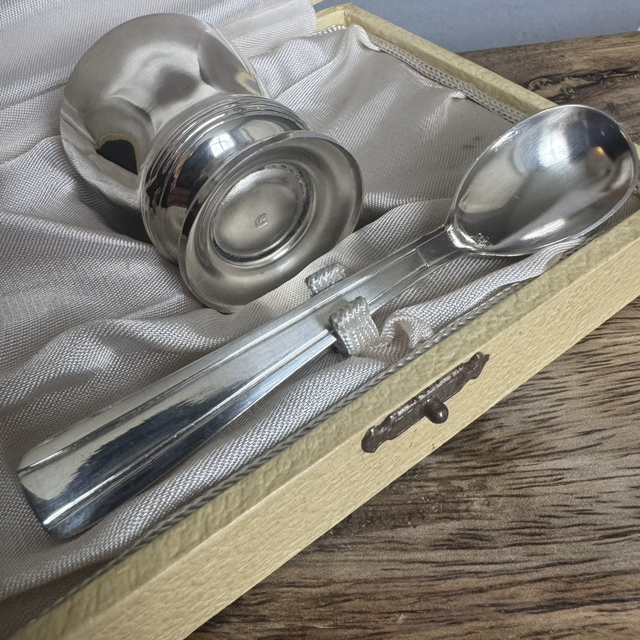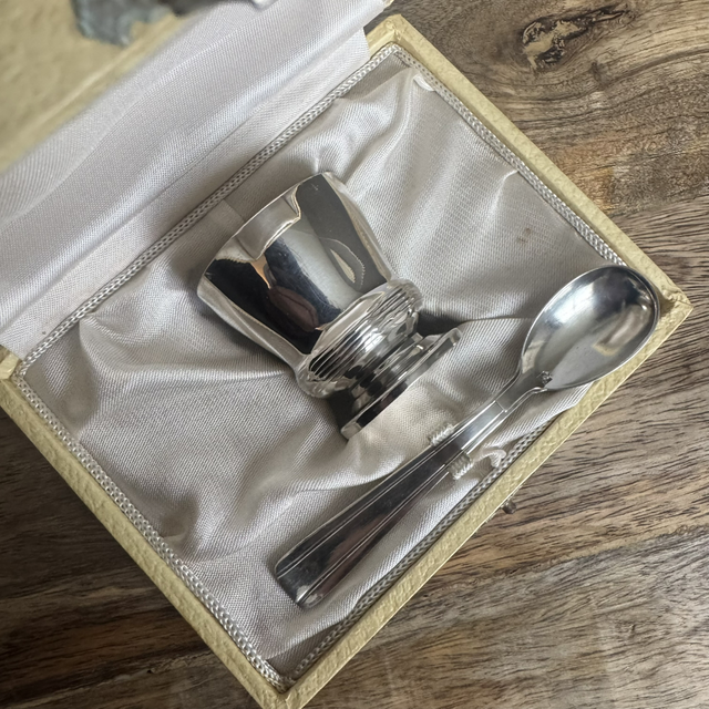 Ensemble coquetier,cuillère à oeuf, timbale et rond de serviette en Argent des années 50 Dans son coffret d’origine ⚠️Personnalisable uniquement sur la cuillère ⚠️Pour la personnalisation il suffit de me l’indiquer dans l’encart prévu à cet effet MESSAGE A L’ATTENTION DU COMMERÇANT(au dessus de la livraison dans votre panier)