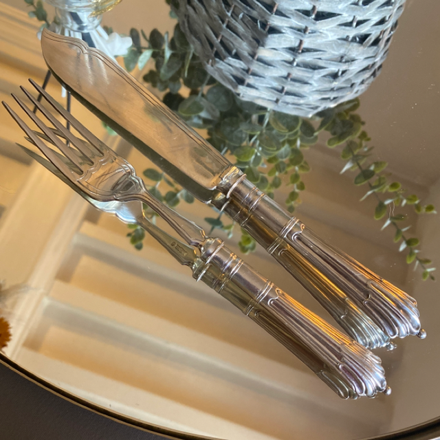 Joli duo anglais année 50 Adulte Fourchette en argent et couteau en argent ⚠️Pour la personnalisation il suffit de me l’indiquer dans l’encart prévu à cet effet MESSAGE A L’ATTENTION DU COMMERÇANT(au dessus de la livraison dans votre panier) Livrée dans sa jolie pochette jute et dentelle