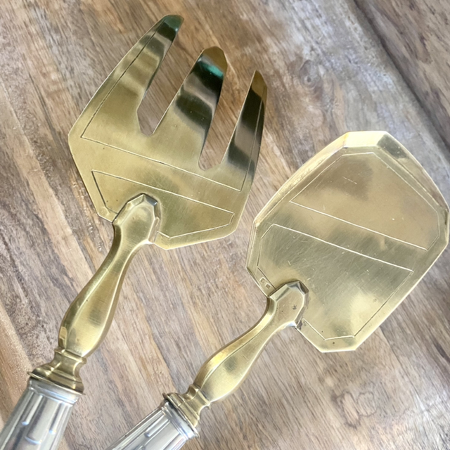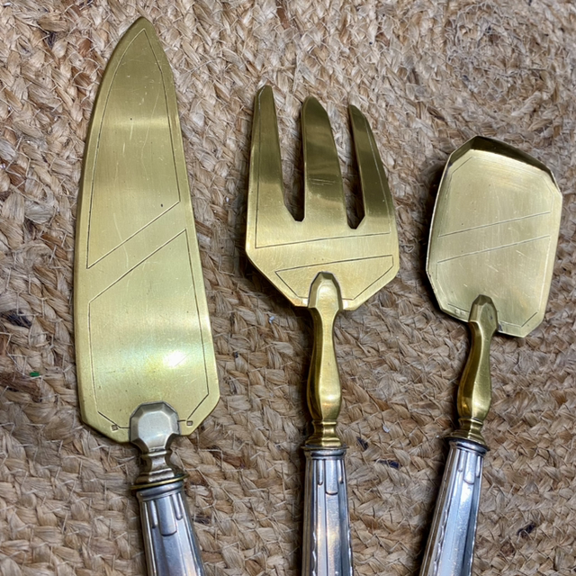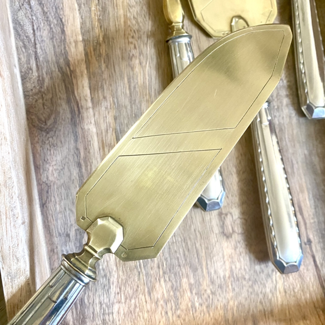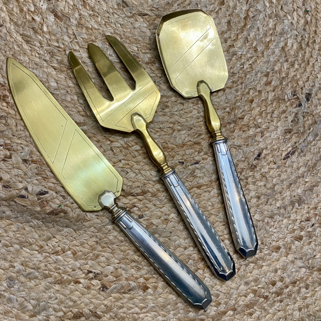 Comprenant : une pelle à tarte/couteaux, une grande fourchette de service, une grande cuillère semi plate