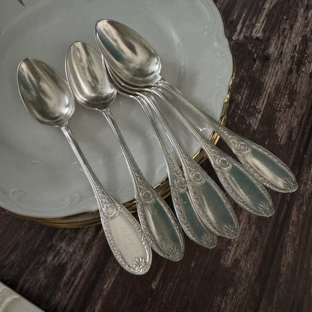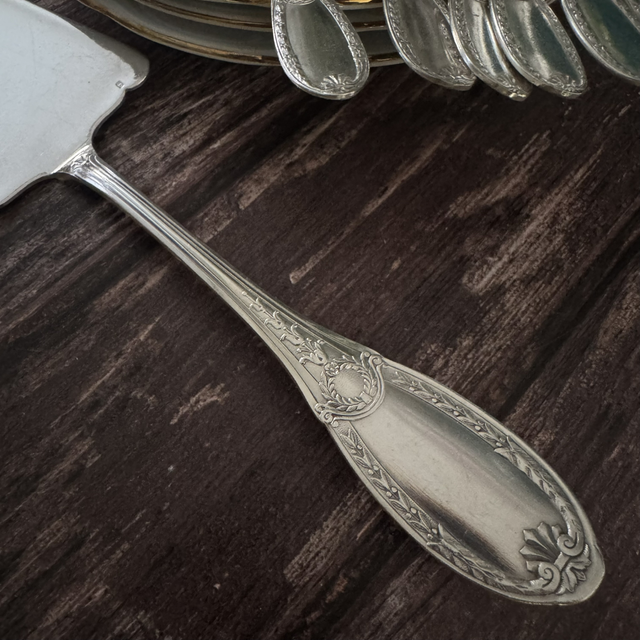 comprenant 6 cuillères magnifiquement travaillées et sa pelle à tarte assortie RARE DANS CET ÉTAT
