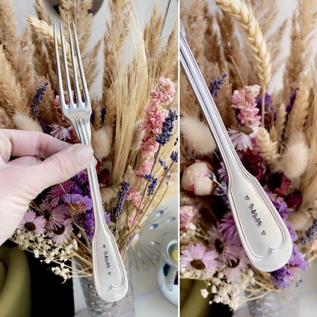 ⚠️Pour la personnalisation (ATTENTION seulement prénom ou motif possible sous les piques de la fourchette ) il suffit de me l’indiquer dans l’encart prévu à cet effet MESSAGE A L’ATTENTION DU COMMERÇANT(au dessus de la livraison dans votre panier) -si gravure supplémentaire sur le manche choisir l’option plus haut-) livrée dans son pochon cadeau