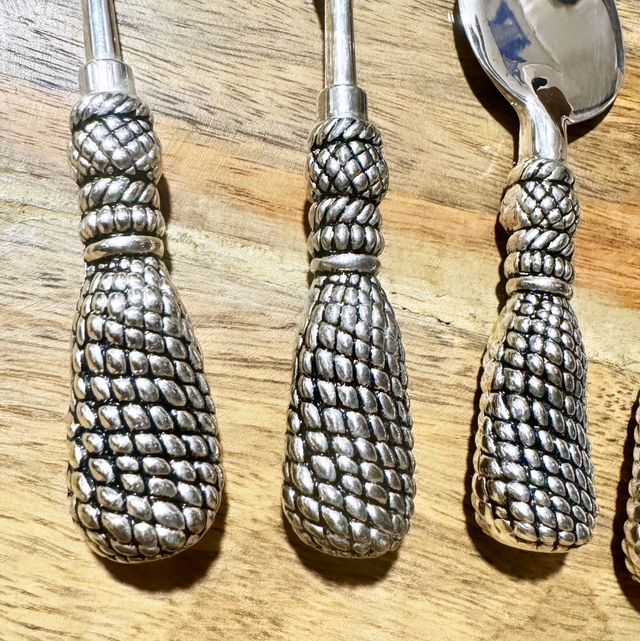 Ensemble des années 70 RARE modèle manche style corde, 5 pièces en ARGENT un couteau à tartiner , un couteau à fromage, une pelle à fromage et son pique à fromage, et la cuillère Personnalisable sur les 4 pièces (pas sur le pique) (Coffret complet velour visible dans la catégorie coffret vintage) ⚠️Pour la personnalisation il suffit de me l’indiquer dans l’encart prévu à cet effet MESSAGE A L’ATTENTION DU COMMERÇANT(au dessus de la livraison dans votre panier)