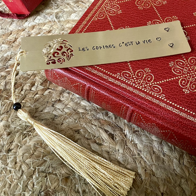 Joli marque page en laiton doré avec pompon.
