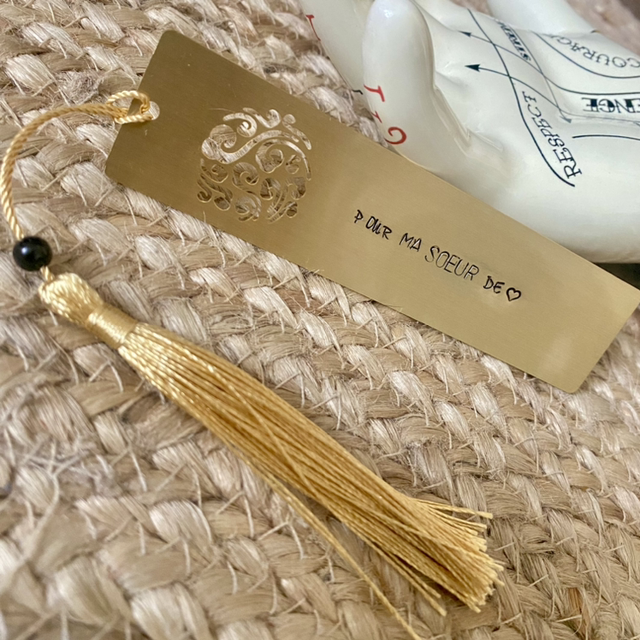 Joli marque page en laiton doré avec pompon.