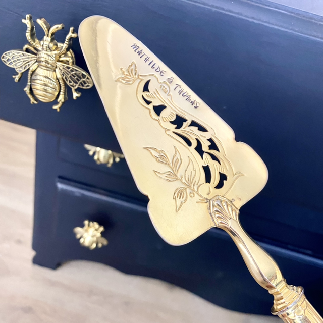 Jolie pelle en plaqué or sculptée ajourée avec inscription Mathilde & Thomas