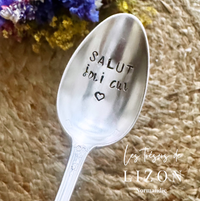 Jolie cuillère vintage plaqué argent gravée SALUT joli cul