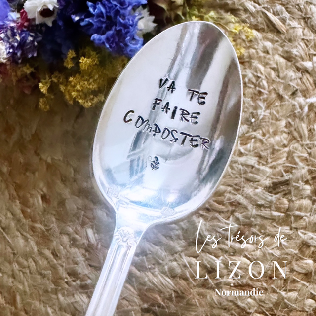 Jolie cuillère vintage plaqué argent gravée va te faire composter